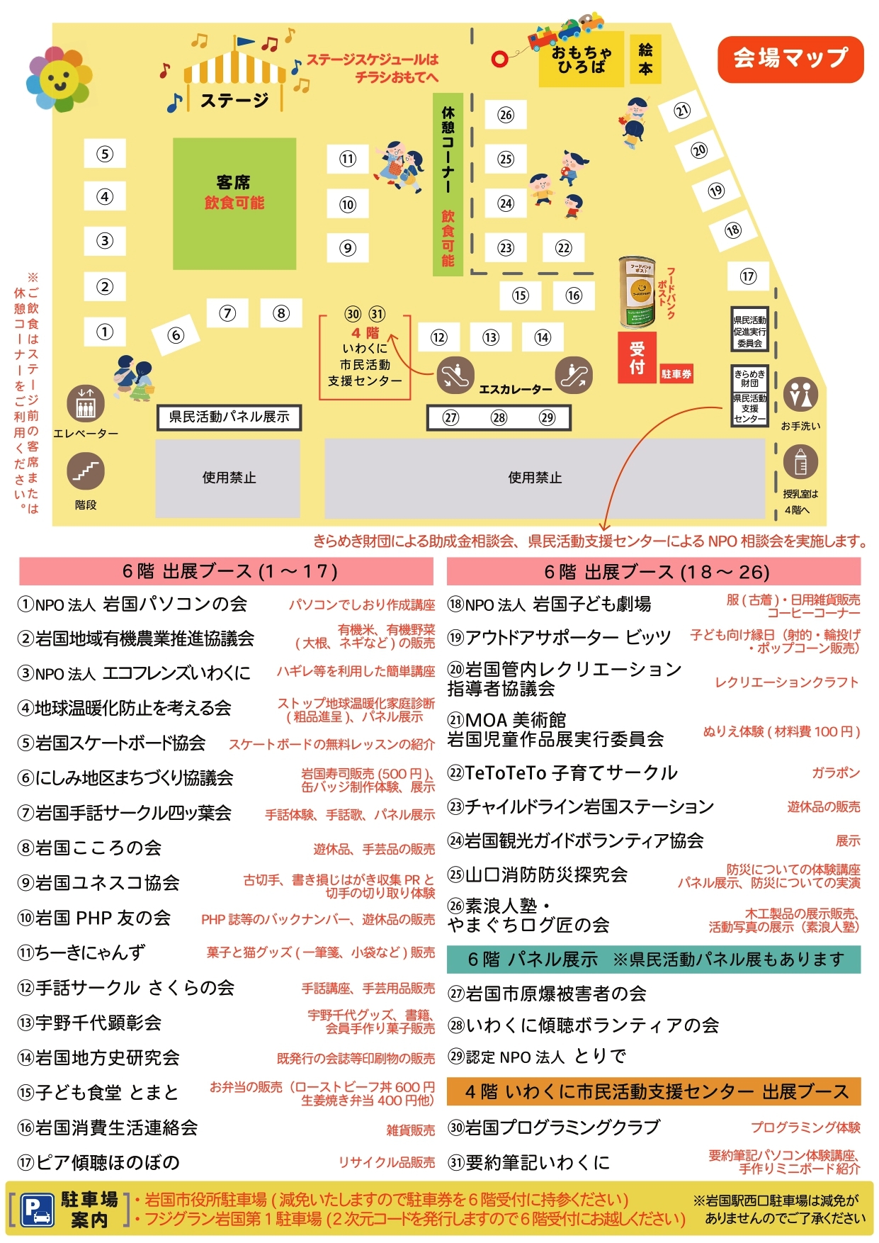 ダンス・演奏・防災実演・おもちゃ作り、工作・手作り品、遊休品、古着販売・岩国寿司、弁当販売・手話、点字、要約筆記体験・プログラミング体験・子ども縁日・NPO法人運営相談・助成金相談・県民活動パネル展など