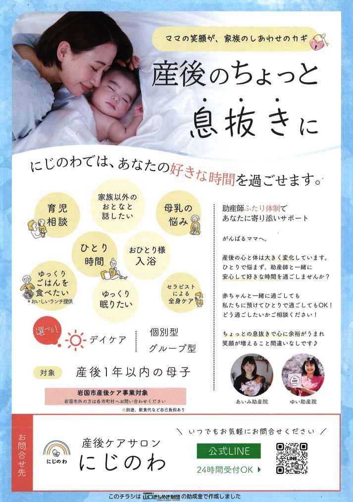 「岩国市周東町のあいみ助産院」と「岩国市海土路町のゆい助産院」が、産後ケアと地域助産師の役割を広めるために作ったコンビ名です。