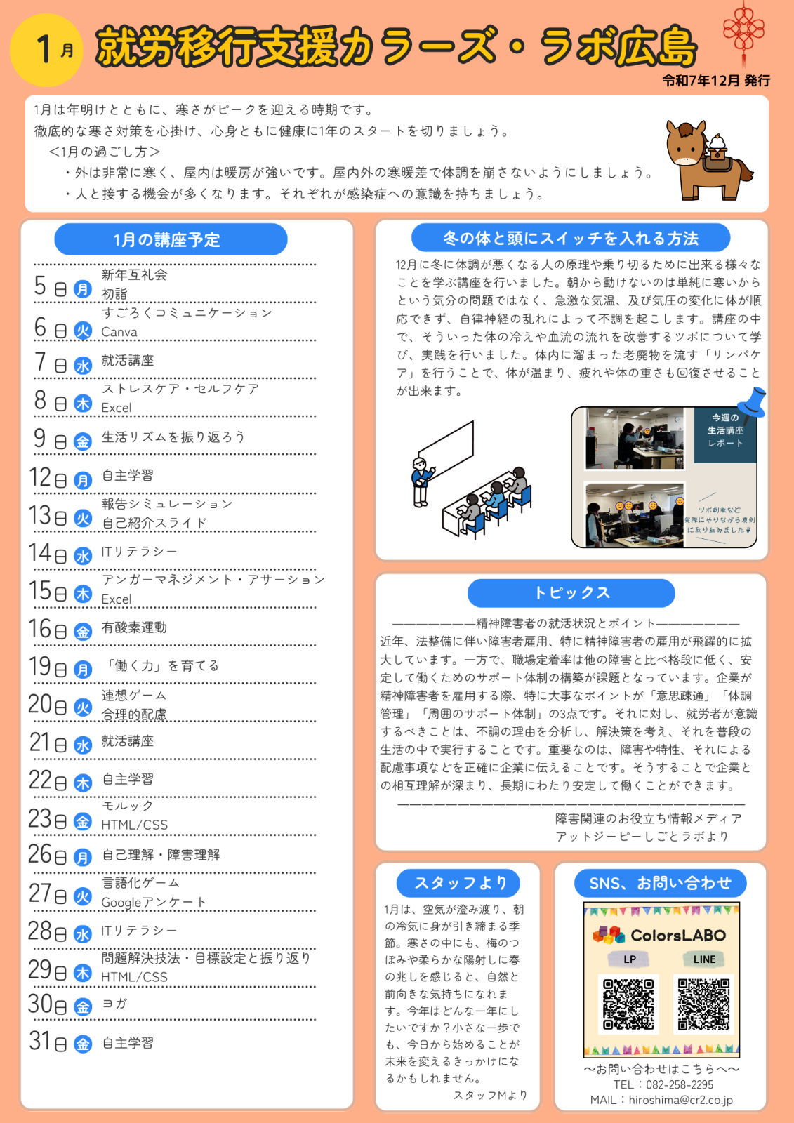 カラーズ・ラボ広島では、健康管理などの生活講座、就活や働いてから必要なビジネススキル、パソコンを使った仕事に必要なスキルを習得できるように多種プログラムをご用意しています。