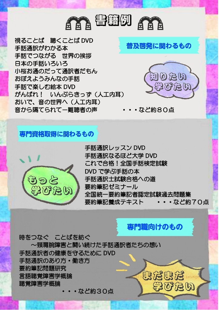 手話や要約筆記など「きこえの支援」に役立つ書籍やDVDを貸し出しています。