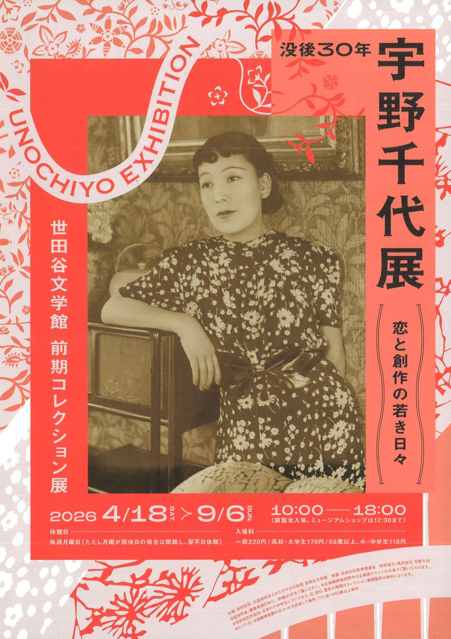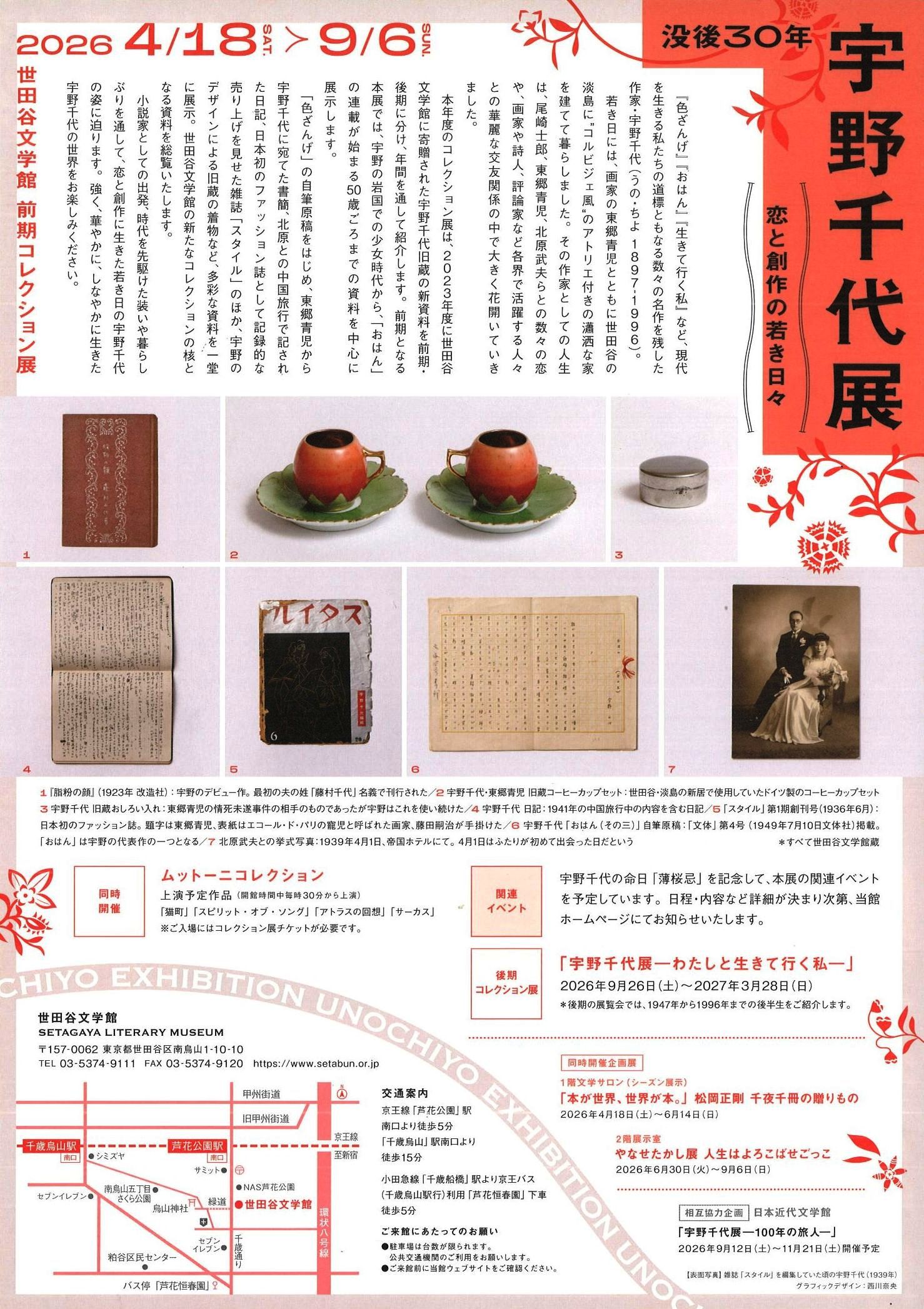 若き日には、画家の東郷青児とともに世田谷の淡島に“コルビジェ風”のアトリエ付きの瀟洒な家を建てて暮らしました。その作家としての人生は、尾崎士郎、東郷青児、北原武夫らとの数々の恋や、画家や詩人、評論家など各界で活躍する人々との華麗な交友関係の中で大きく花開いていきました。本展は、2023年度に世田谷文学館に寄贈された宇野千代旧蔵の新資料を前期・後期に分け、年間を通してご紹介するものです。