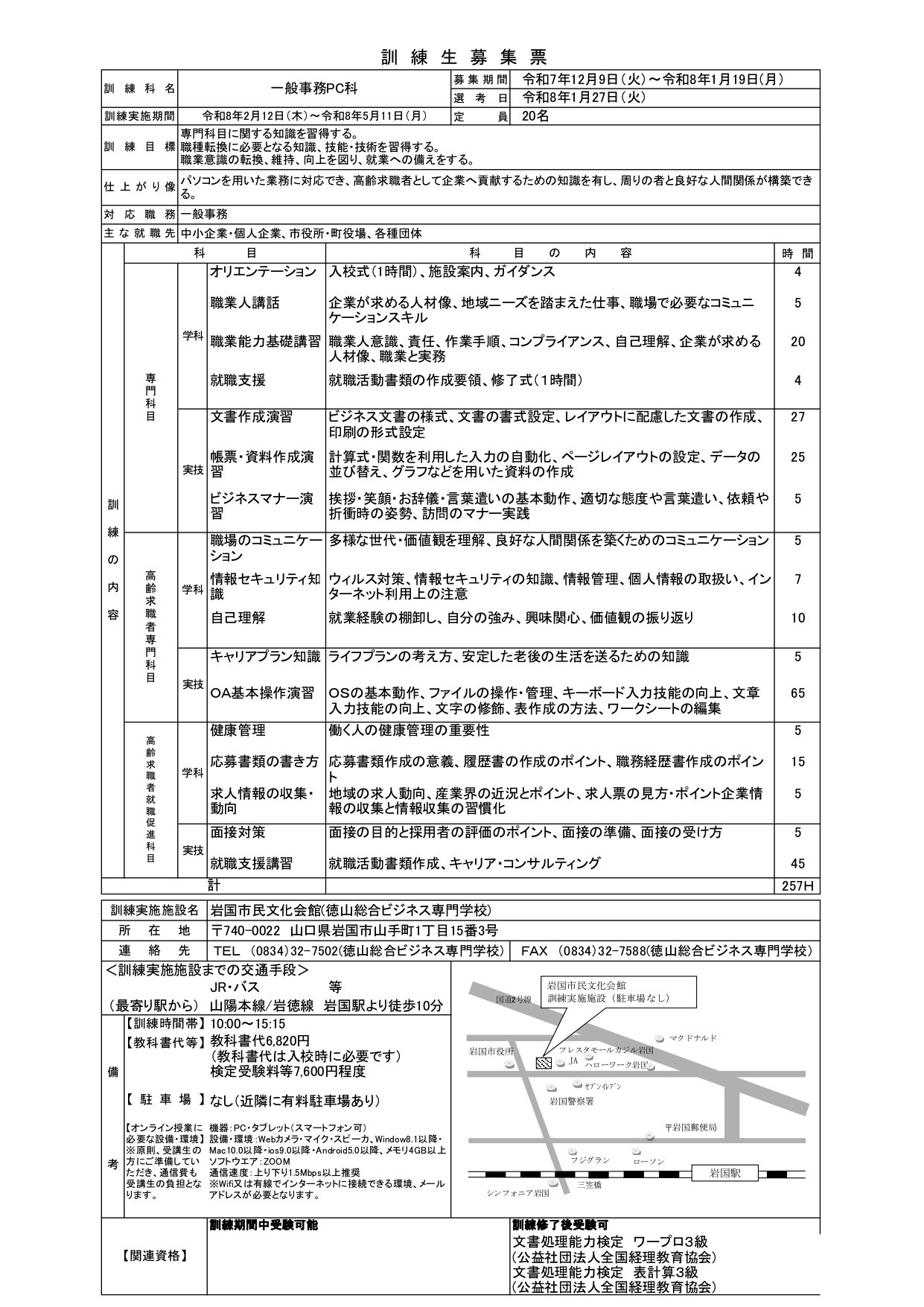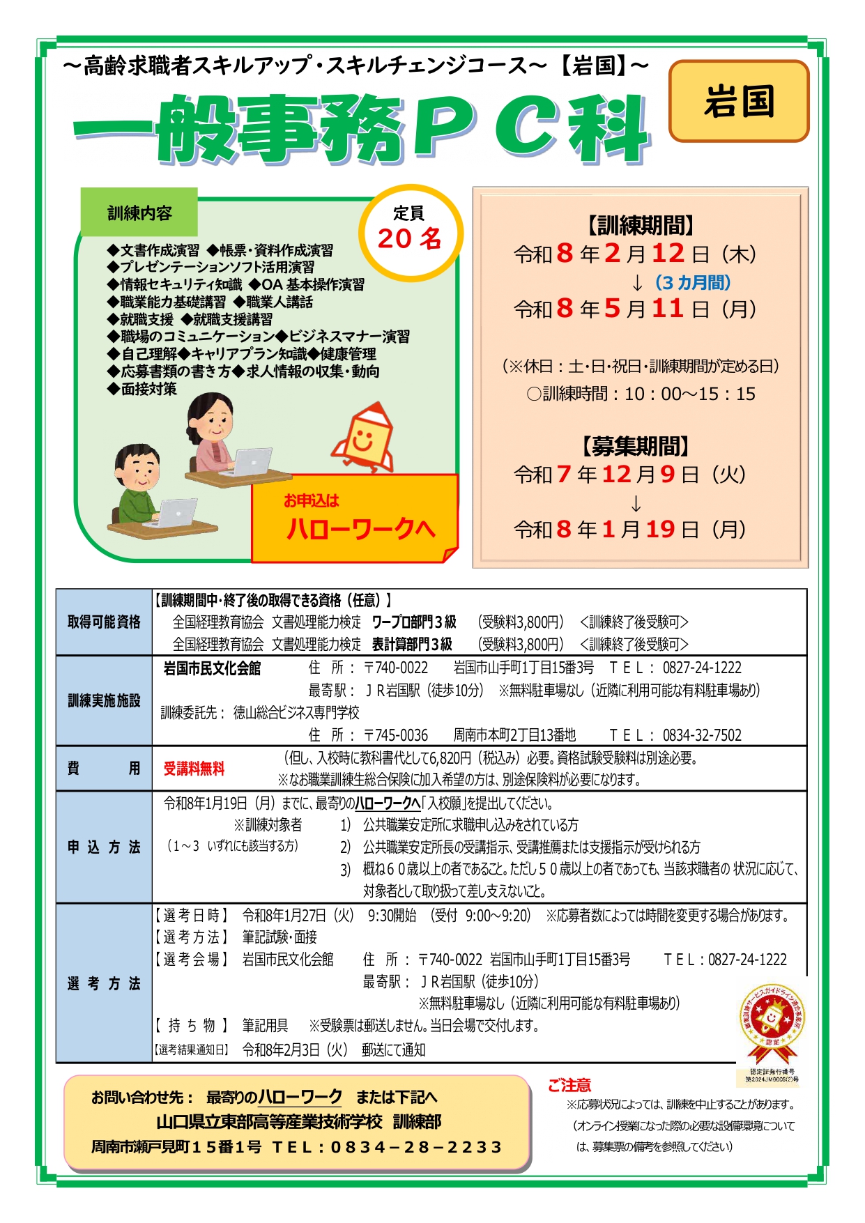 一般事務PC科 高齢求職者スキルアップ・スキルチェンジコース【岩国】