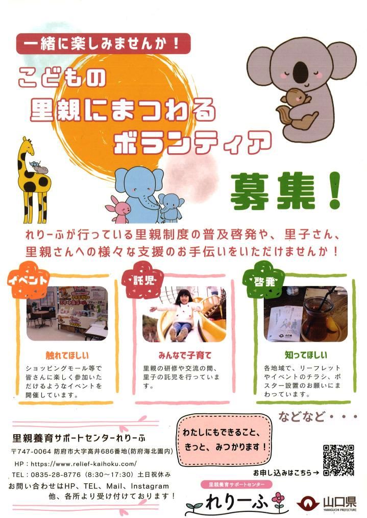 れりーふが行っている里親制度の普及啓発や、里子さん、里親さんへの様々な支援のお手伝いをいただけませんか!