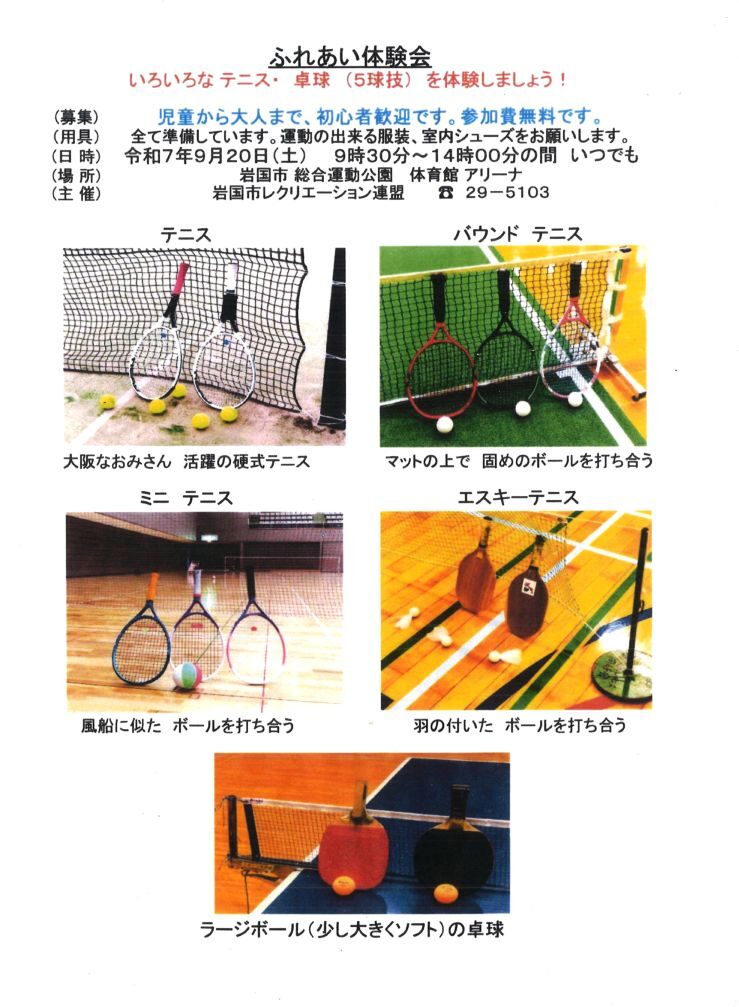 2025年8月27日 / 最終更新日時 : 2025年8月20日 ici 講演・講座・講習 第14回岩国市レクリエーションふれあい体験「ふれあい球技体験」9/20 日時: 令和7年9月20日(土) 09:30~14:00 場所: 岩国市総合体育館 アリーナ 参加無料 内容: ・テニス ・バウンドテニス ・ミニテニス ・エスキーテニス 持参品: 運動のできる服装、室内シューズ、タオル、飲み物 テニス・ラージボール卓球の体験会 主催:岩国市レクリエーション連盟 施設情報 岩国市総合体育館 お問い合わせ: 文化スポーツ課 電話 0827(29)5103 (「第14回岩国市レクリエーションふれあい体験」リーフより) 新着情報 2025年10月17日 NEW! ヤングケアラーを知っていますか? 2025年10月17日 NEW! 児童文学作家 あんびるやすこさん講演会 11/16 2025年10月16日 NEW! AA中四国地域ラウンドアップ2025 11/7~11/9 2025年10月16日 NEW! 令7年「月下秋思~観月の集い~」 10/25 2025年10月15日 NEW! 岩国市合併20周年記念 シティロゲin岩国 2025年10月15日 じんけんフェスタ2025inいわくに 11/12 2025年10月15日 人権啓発 2025年10月14日 令和7年度インフルエンザ・新型コロナワクチン予防接種料金の助成 岩国市 2025年10月14日 青少年のための科学の祭典2025 in 岩国 11/9 2025年10月10日 岩国市民手話講座 12月毎週木曜日(4日・11日・18日・25日)全4回 このページは岩国市の福祉関連の総合情報サイト「ふれあいeタウンいわくに」です 関連情報関連情報はありません