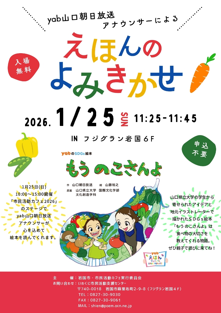 2026年1月25日(日)10:00~15:00開催の「市民活動カフェ2026」のステージでyab山口朝日放送アナウンサーが心を込めて絵本を読んでくれます。