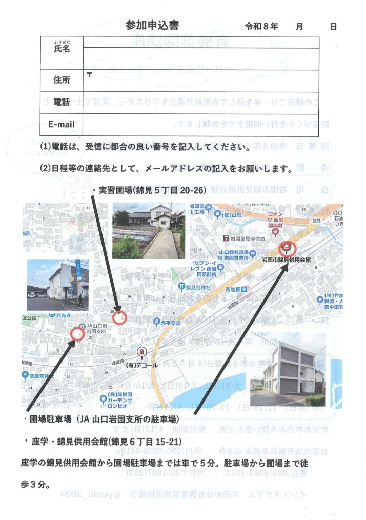 会場: 岩国市錦見供用会館/圃場(裏面地図参照)