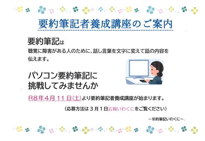 対象 市内に在住または勤務する18歳以上の人で、講座終了後に「全国統一要約筆記者認定試験」を受けることができる人