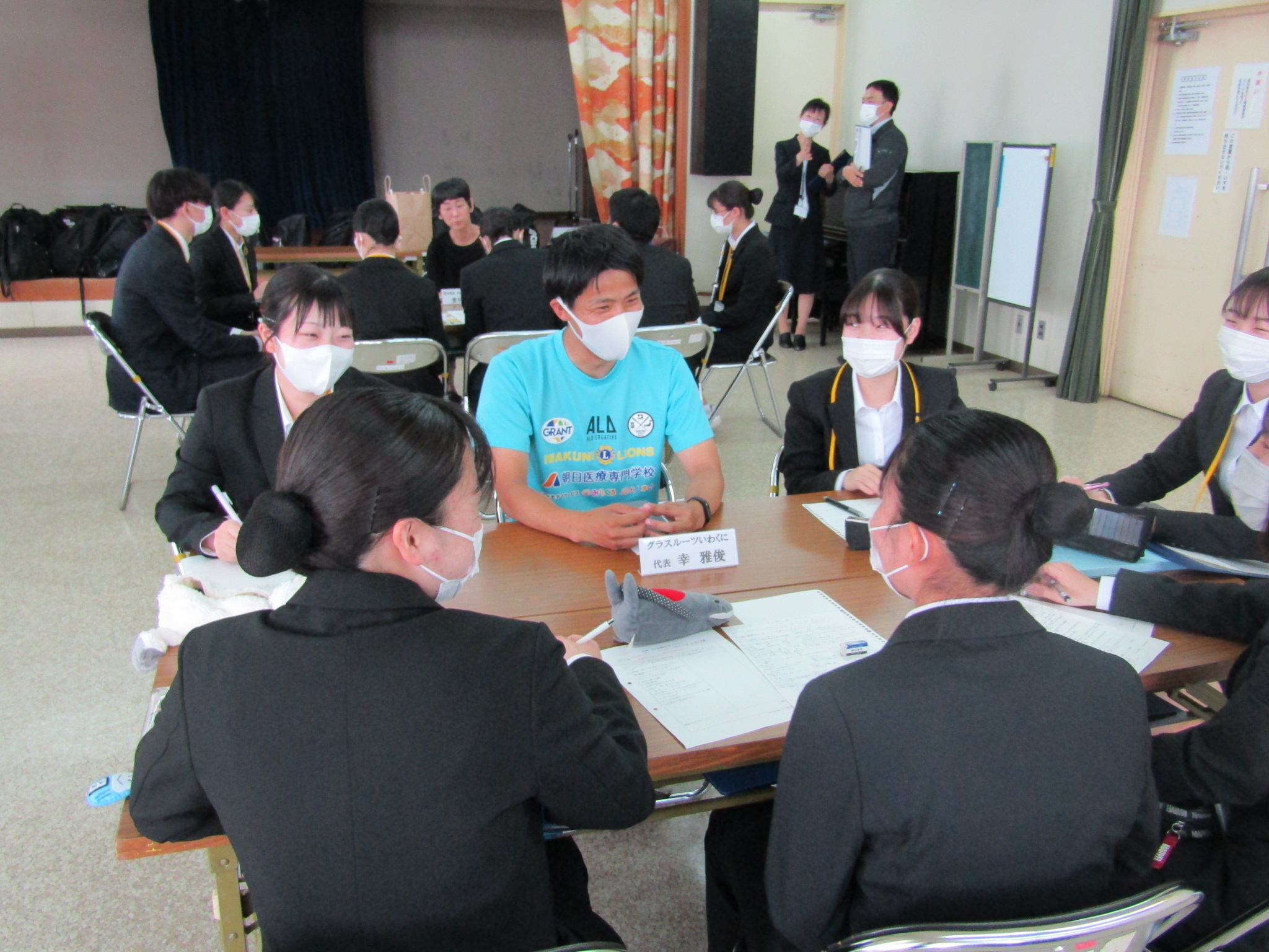 「ボランティアについて話をさせてもらい、熱心に聞いてくれていた。活動をしている岩国PHP友の会では、「素直な心になりましょう」をモットーに、活動を行っている。学生から、「医療はチームなので自身の意見を主張して良いのか迷う場面がある」との質問を受けた。「チームと言うのは、お互いが意見を言い合い尊重することが大切であり、素直な心で相手の立場になり考える必要がある事を伝えた。」と話していた。