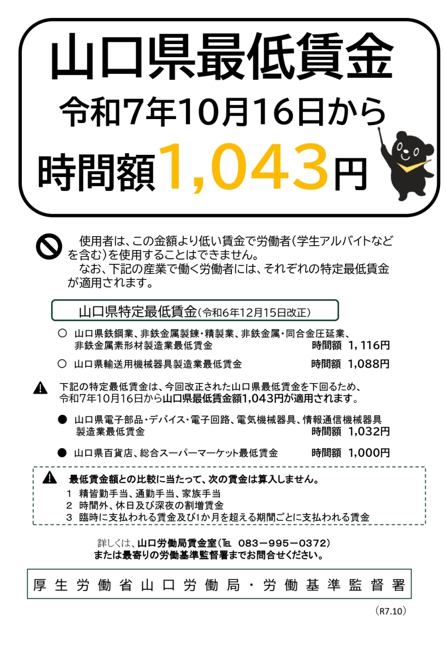 山口県の最低賃金 1,043円 令和7年10月16日より
