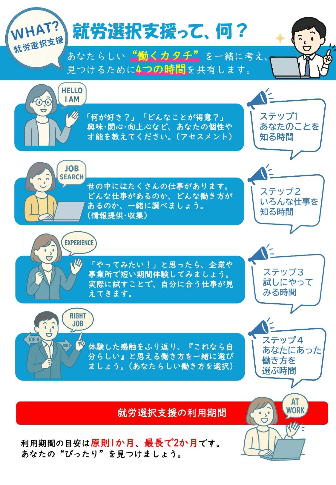 自分が自分に合った働き方や就労系サービスを見つけるお手伝いをする新しい福祉サービスです