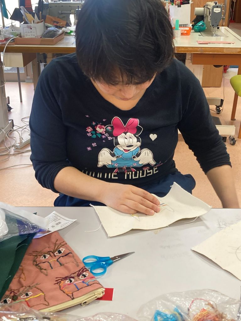 以後文子は事業所で、バッグに刺繍を施す作業を続けています。2020年には山口県が行った「障害者文化芸術での調査発掘事業」で、優れた作家のひとりとして選定されました。文子の刺繍を評価して支援していただいた、山口市在住のハンドバックデザイナーの安部さんは「ふみちゃんの作品は見る人を幸せにする」と言ってくれます。彼女によると、文子は人の評価など気にすることなく、自分の世界を表現するところがいいのだとのことです。競争社会で自己肯定感を育てにくい今の社会で、文子の作品は癒しをもたらしてくれるのかもしれません。