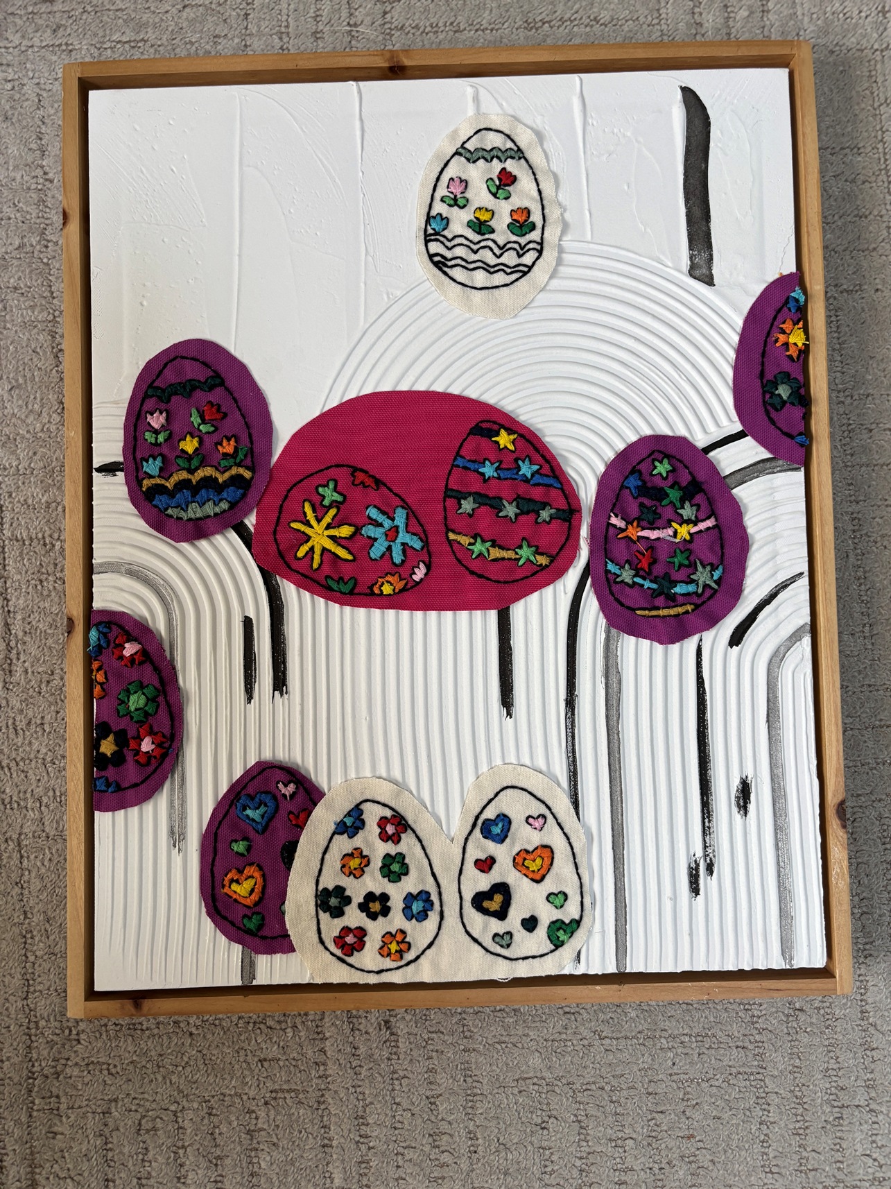 昨年(令和7年)12月、次女の文子は華道家の蔵重伸先生とのコラボ作品「夢のかたち」を岩国市に寄贈して、岩国市長から感謝状をいただきました。作品は文子が刺繍したクジャクや花、コマドリなどを、縦120cm・横93cmのボードに、蔵重先生が生け花よろしく配置・貼り付けて、一つの作品にしたものです。現在 岩国市役所の一階に展示されています。