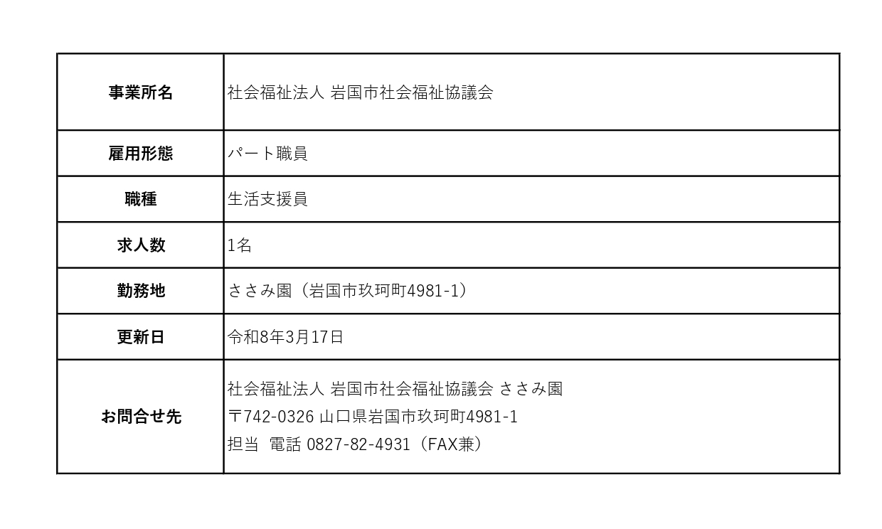 2026年3月17日 / 最終更新日時 : 2026年3月10日 ici 介護・生活支援関連(パート) 求人情報 社会福祉法人 岩国市社会福祉協議会 生活支援員 パート職員 社会福祉法人 岩国市社会福祉協議会 🟢ホームページはこちら 新着情報 2026年3月17日 NEW! 里親制度説明会「里親カフェ」 2026年3月17日 NEW! 求人情報 社会福祉法人 岩国市社会福祉協議会 生活支援員 パート職員 2026年3月16日 NEW! 岩国市英語交流センター PLAT ABC4周年記念 3/21-22 2026年3月16日 NEW! 日米交流事業 篆刻体験講座 3/21 2026年3月13日 コトリカ 児童発達支援事業所 2026年3月13日 ひとりで悩んでいませんか?~岩国市困りごと相談窓口一覧をご活用ください~ 2026年3月13日 令和8年4月1日より岩国市社会福祉協議会移転のお知らせ(「くらし自立応援センターいわくに」除く) 2026年3月12日 カルチャーフェスティバル(Culture Festival)開催 3/15 2026年3月12日 令和8年 利き酒列車 3/20・21・22・23 2026年3月11日 医療法人社団 安東ファミリー歯科 このページは岩国市の福祉関連の総合情報サイト「ふれあいeタウンいわくに」です 関連情報関連情報はありません
