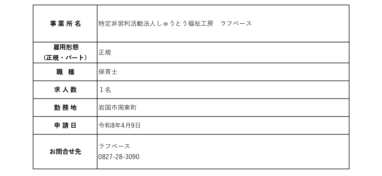 求人情報 特定非営利活動法人しゅうとう福祉工房 ラフベース 保育士 正社員