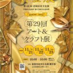 2025年11月13日 / 最終更新日時 : 2025年11月11日 ici 企画展・展示・展覧会 第29回アート&クラフト展「黄金展」11/21-22-23 日時: 2025年11月21日(金)~11月23日(日) 10:00~16:00(ラスト日10:00~15:00) 場所: 岩国市民文化会館 展示室 料金: 入場無料 施設情報 岩国市民文化会館 お問合せ先 アート […]